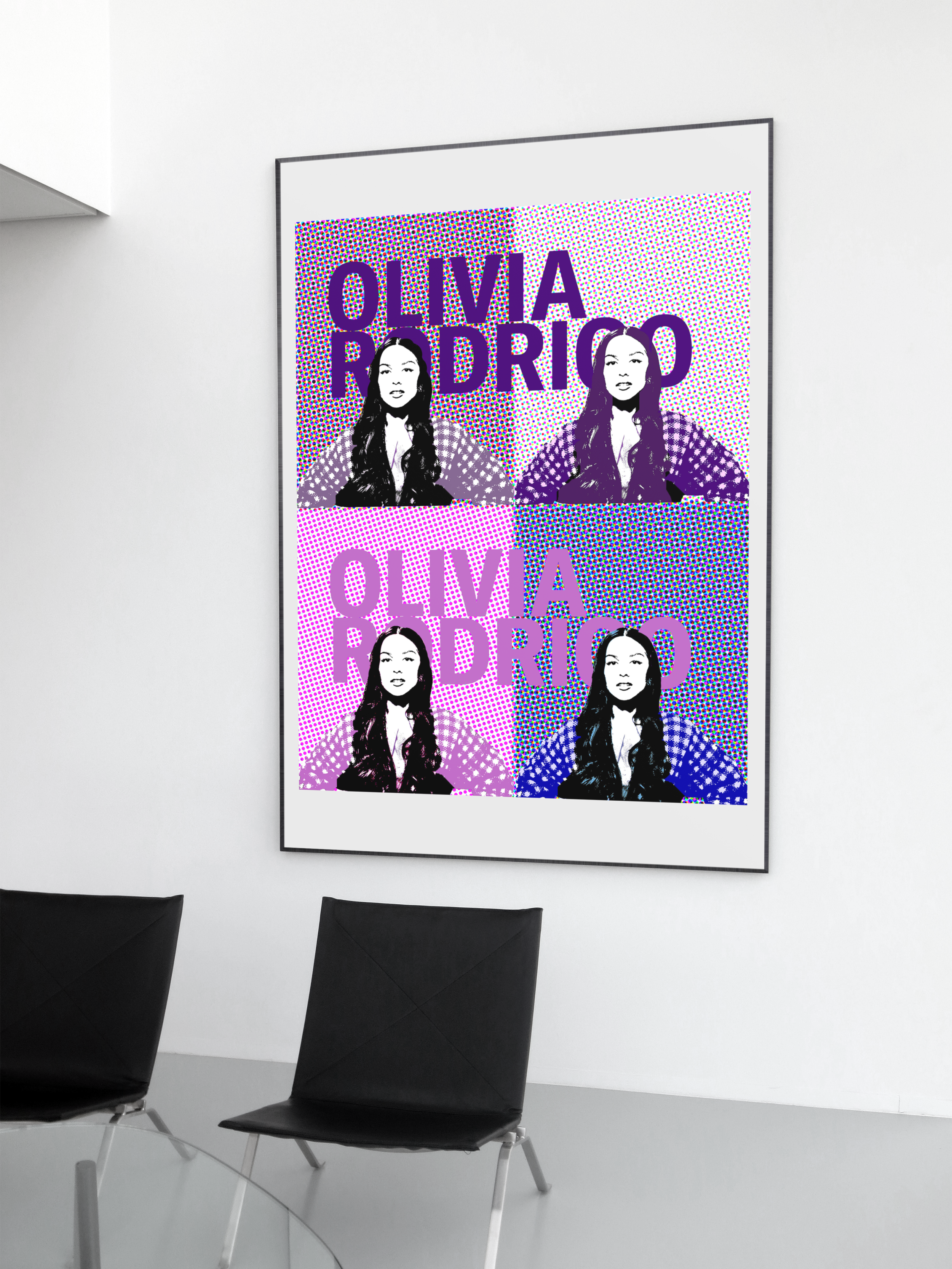 In my Design and Composition class, we were asked to create a pop art piece featuring a famous figure. I chose Olivia Rodrigo and reimagined her portrait using four different colorways to explore contrast, repetition, and visual impact. This project allowed me to experiment with bold color, composition, and stylization while maintaining a cohesive series. I created a poster that would serve as a decorative graphic of an Olivia Rodrigo fan.