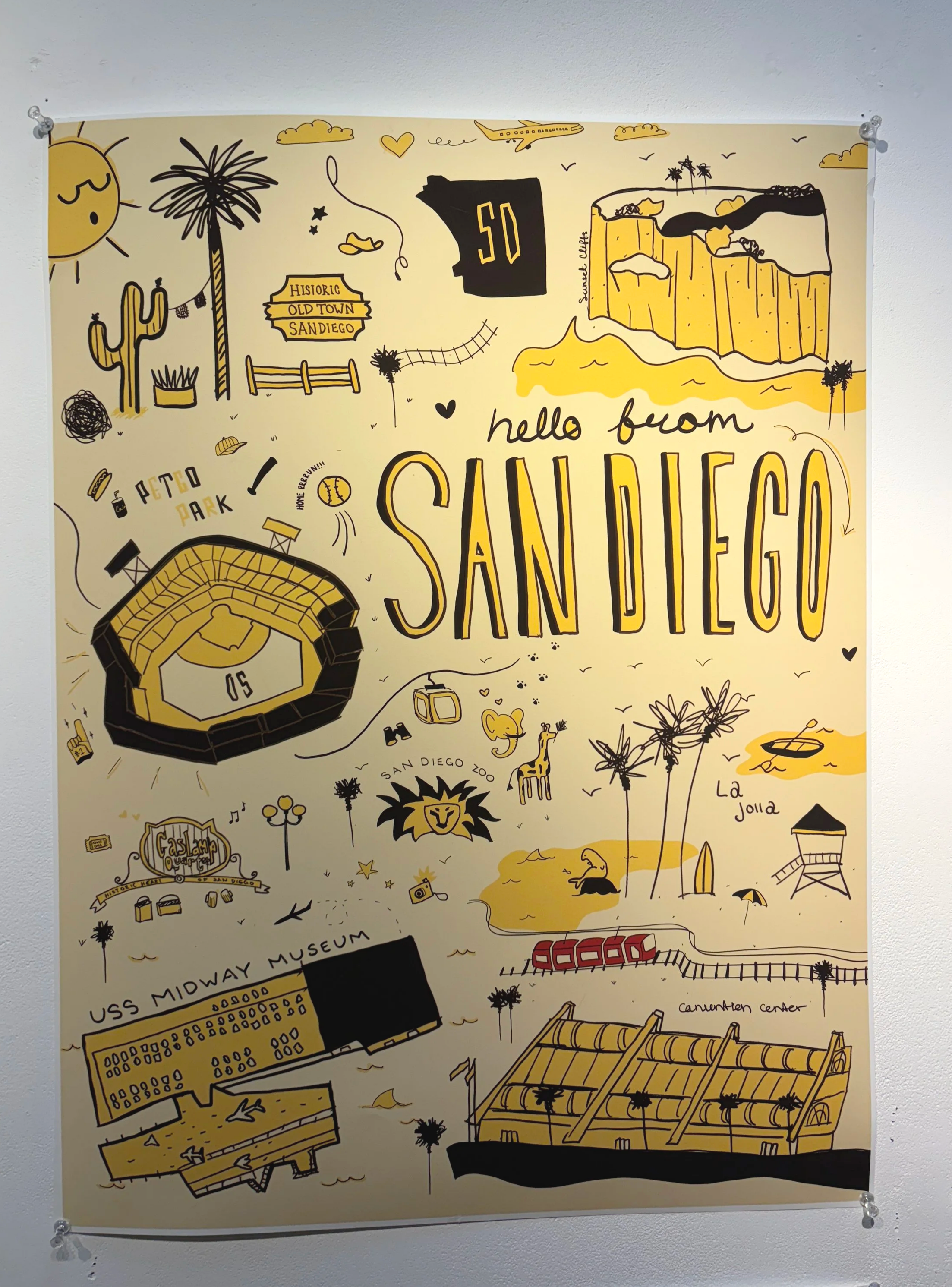 For my poster and information design class, we were asked to create a travel poster highlighting eight destinations within a chosen city. I chose San Diego and decided to take an illustrative approach, hand drawing the entire poster in Procreate. To me, San Diego has a peaceful and laid back vibe, which is why I leaned into a handwritten style to make it feel personal and inviting.